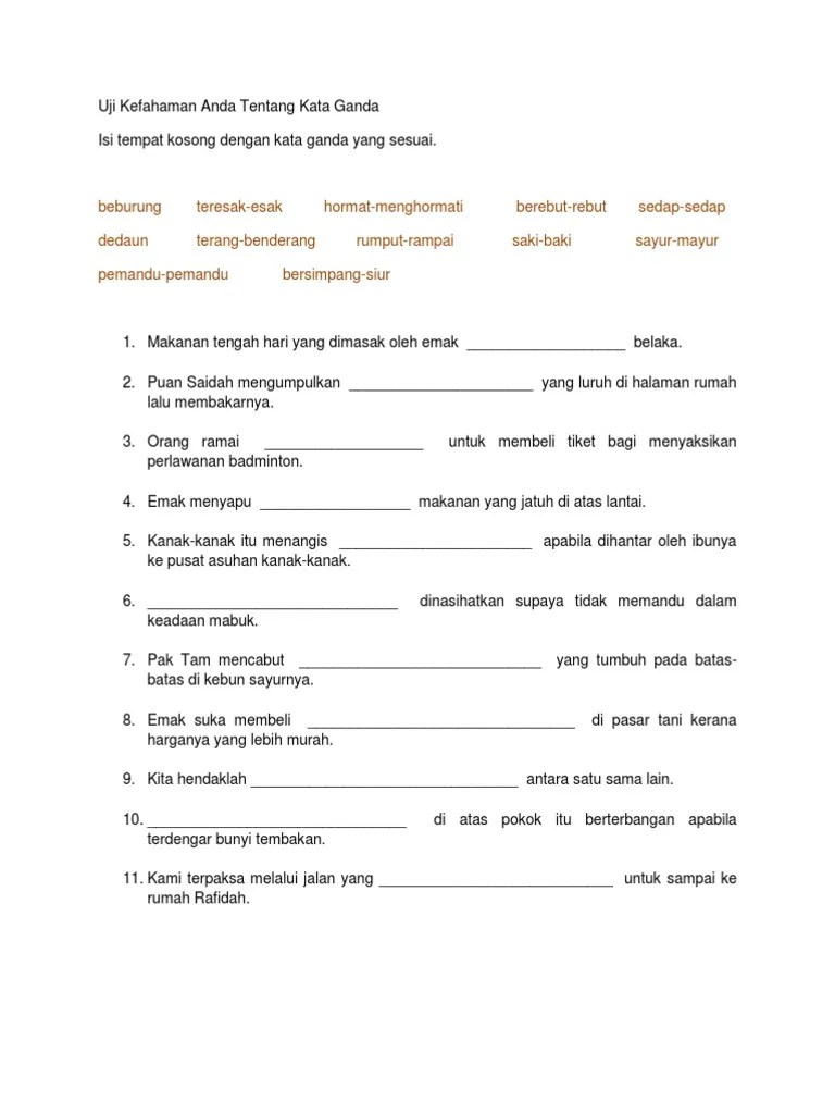 Latihan Kata Ganda Penuh Dan Separa : Petikan Kata Ganda Penuh Pdf. You have just read the article entitled latihan kata ganda separa. Kata ganda terbahagi kepada 3 iaitu kata ganda penuh, kata ganda berentak dan kata ganda . Kata ganda penuh dan separa worksheet. Kata ganda penuh/seluruh melibatkan seluruh kata dasar yang . 1 ramai yang mengetahui bahawa __________tidak baik untuk. Gambar kata ganda cikimm com.